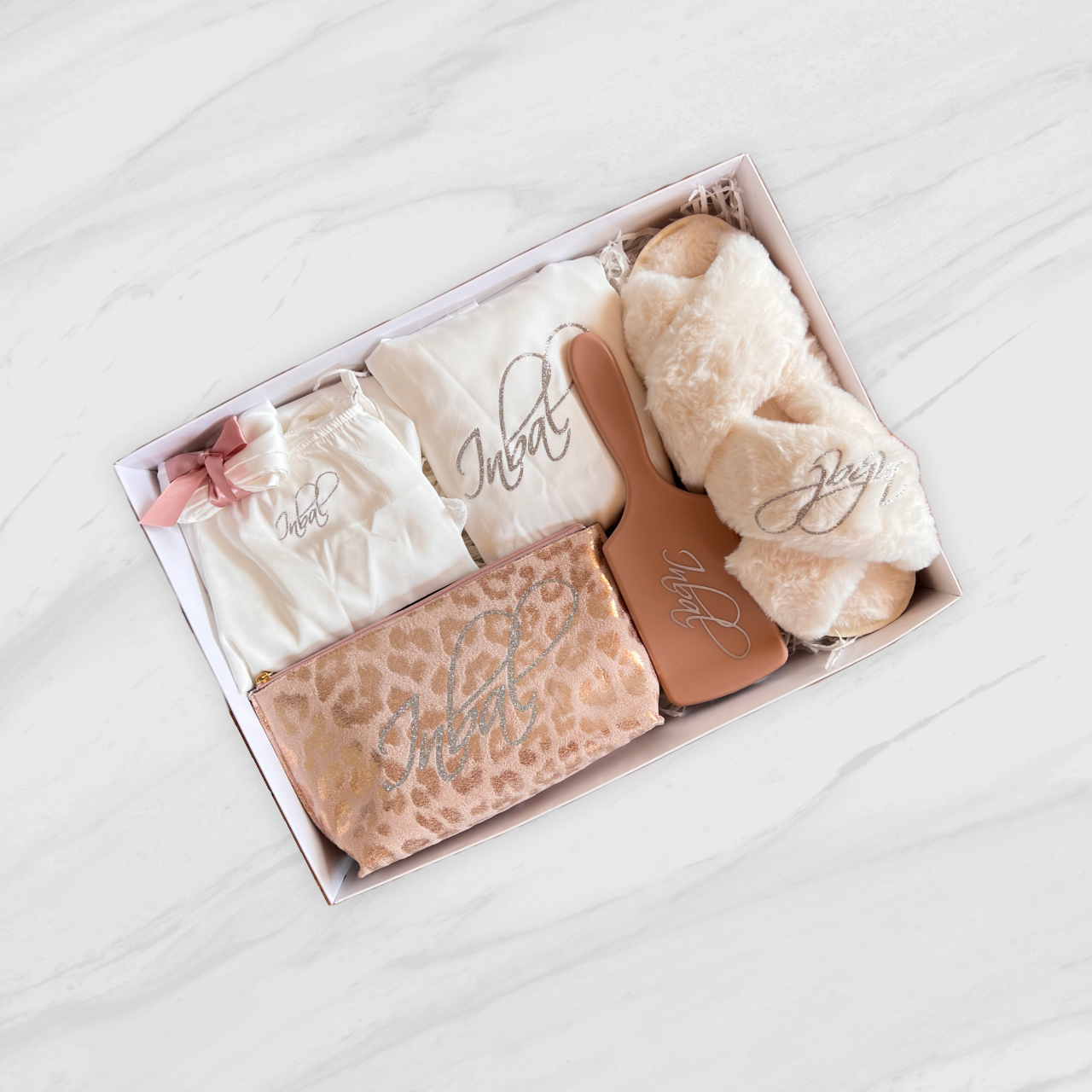 מארז מתנה מושלם מתאים למתנה לכלה או ליום הולדת עגול, מכיל בתוכו כותונת סאטן וחלוק לבן | תיק איפור מנומר | נעלי בית פרותיות | קולב ממותג ומברשת, כל המוצרים ממותגים ומגיעים במארז סגור ומיוחד.
