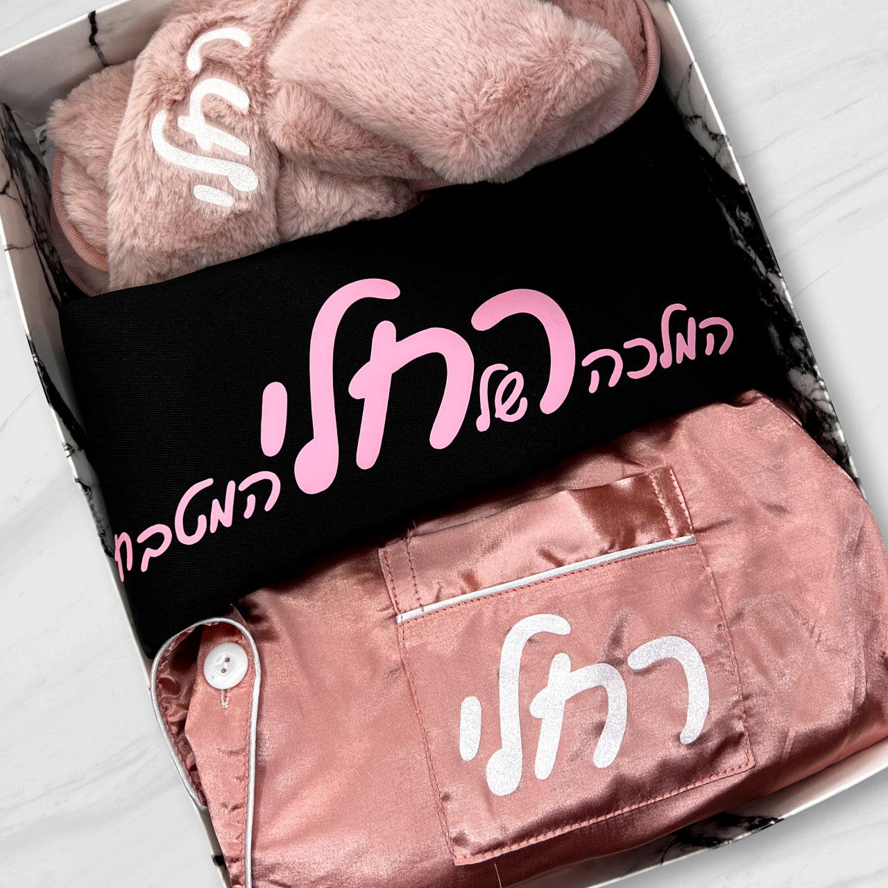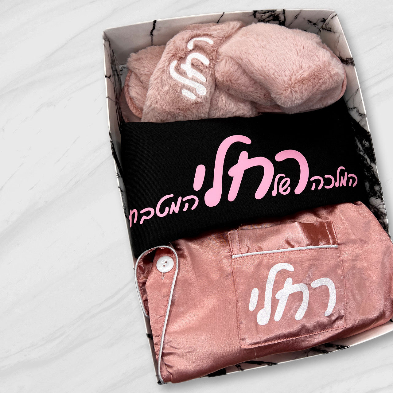 מארז לאמא שאוהבת לבשל כולל בתוכו סינר שחור | נעלי בית | פיג'מת סאטן ארוכה. כל המוצרים ממותגים ומגיעים במארז סגור ומיוחד.