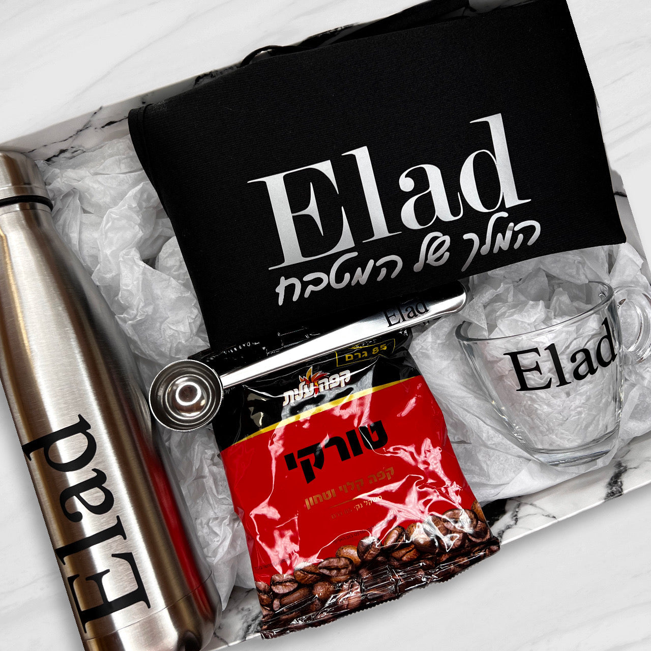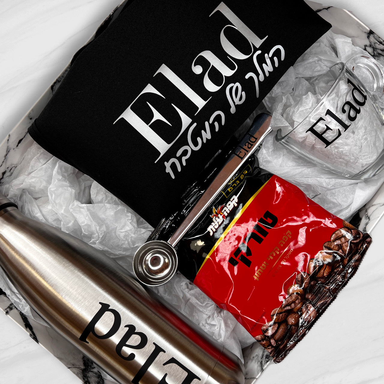 מארז לגבר מבשל הכולל בתוכו סינר שחור | כוס קפה | בקבוק תרמי, קפה שחור עם אטב ממותג, כל המוצרים ממותגים ומגיעים במארז סגור ומיוחד.