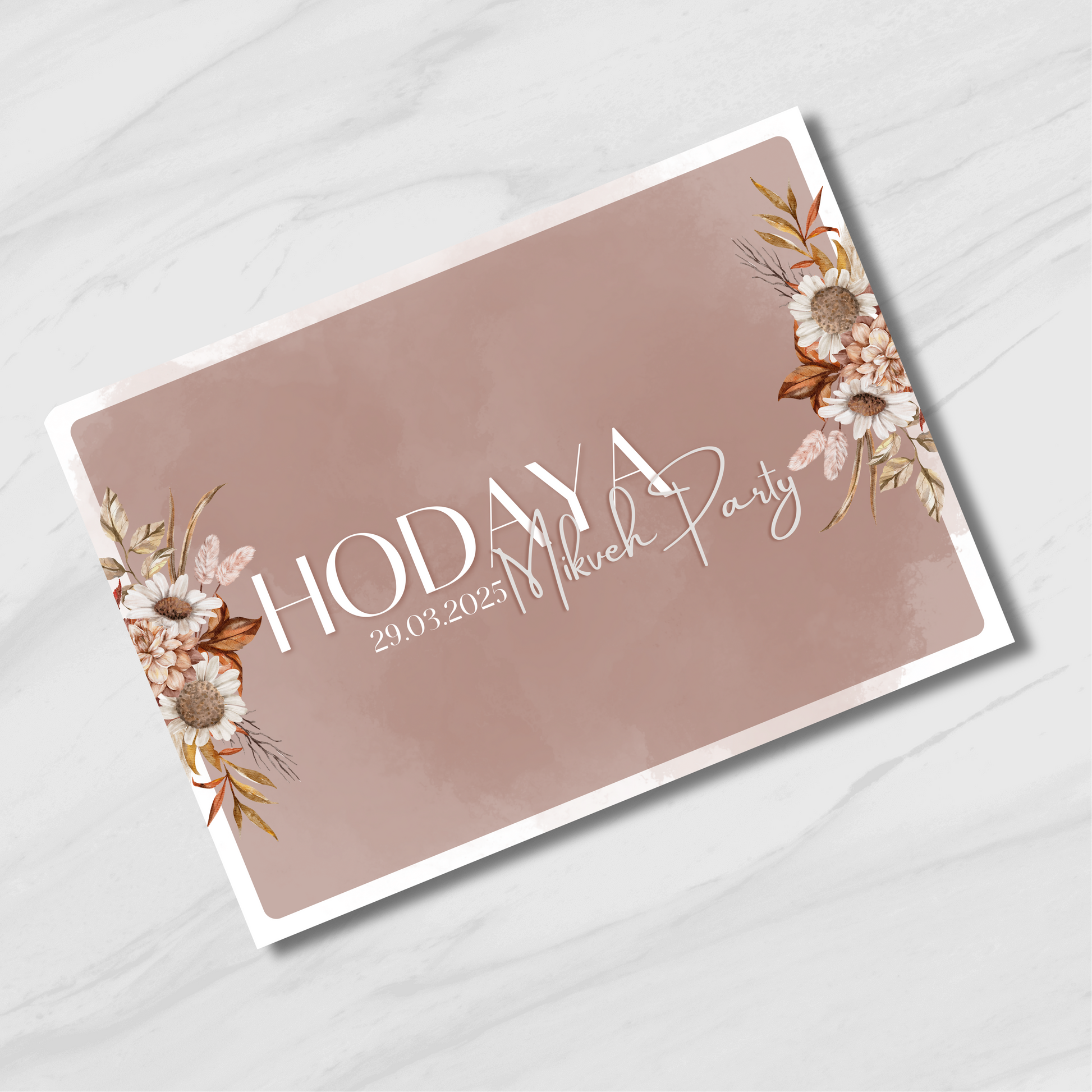 הפלייסמנט הזה משלב צבעוניות חמה ונשית – עם רקע בגוון טרקוטה מעושן ופרחים בגווני אדמה, שמנת וזהב רך. העיצוב יוצר תחושת עומק, חמימות ורוך – מושלם לשולחן שמספר סיפור של אהבה, נשיות וחגיגיות טבעית. השם והתאריך מופיעים בטיפוגרפיה זורמת ומוקפדת שמוסיפה מגע אישי, אלגנטי ומרשים. הפלייסמנט משתלב נהדר עם כלים לבנים, פריטים טבעיים ונרות – ליצירת שולחן שלם ומזמין.