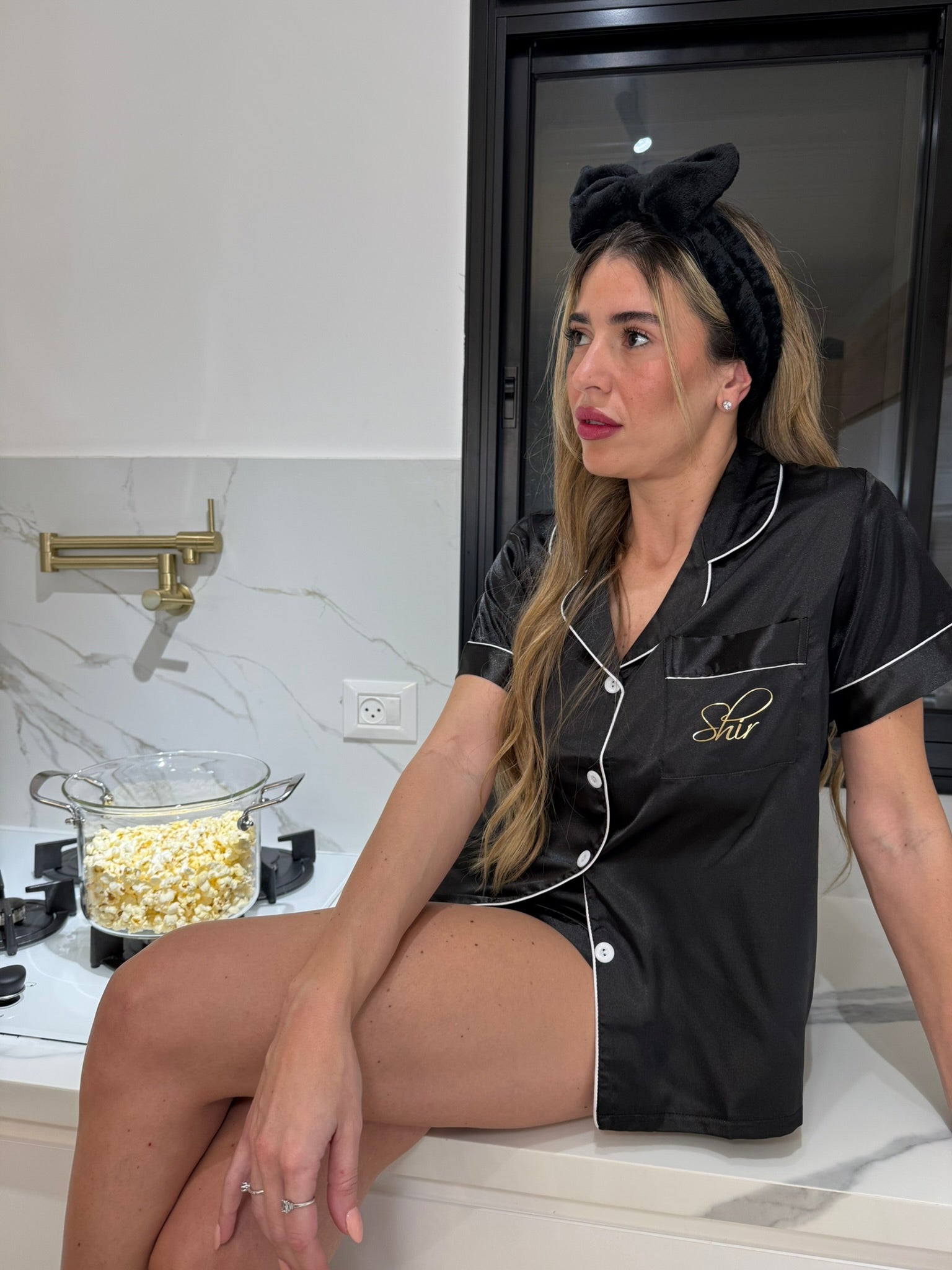 פיג'מת קיץ סאטן בצבע שחור עם פסים לבנים שני חלקים: חולצה מכופתרת עם מכנס קצר מושלמת למתנה ליום הולדת מתנה לשושבינות. מגיעה בשלושה צבעים: שמפניה | ורוד בהיר | לבן ושחור. הדפסת שם לבחירתך.