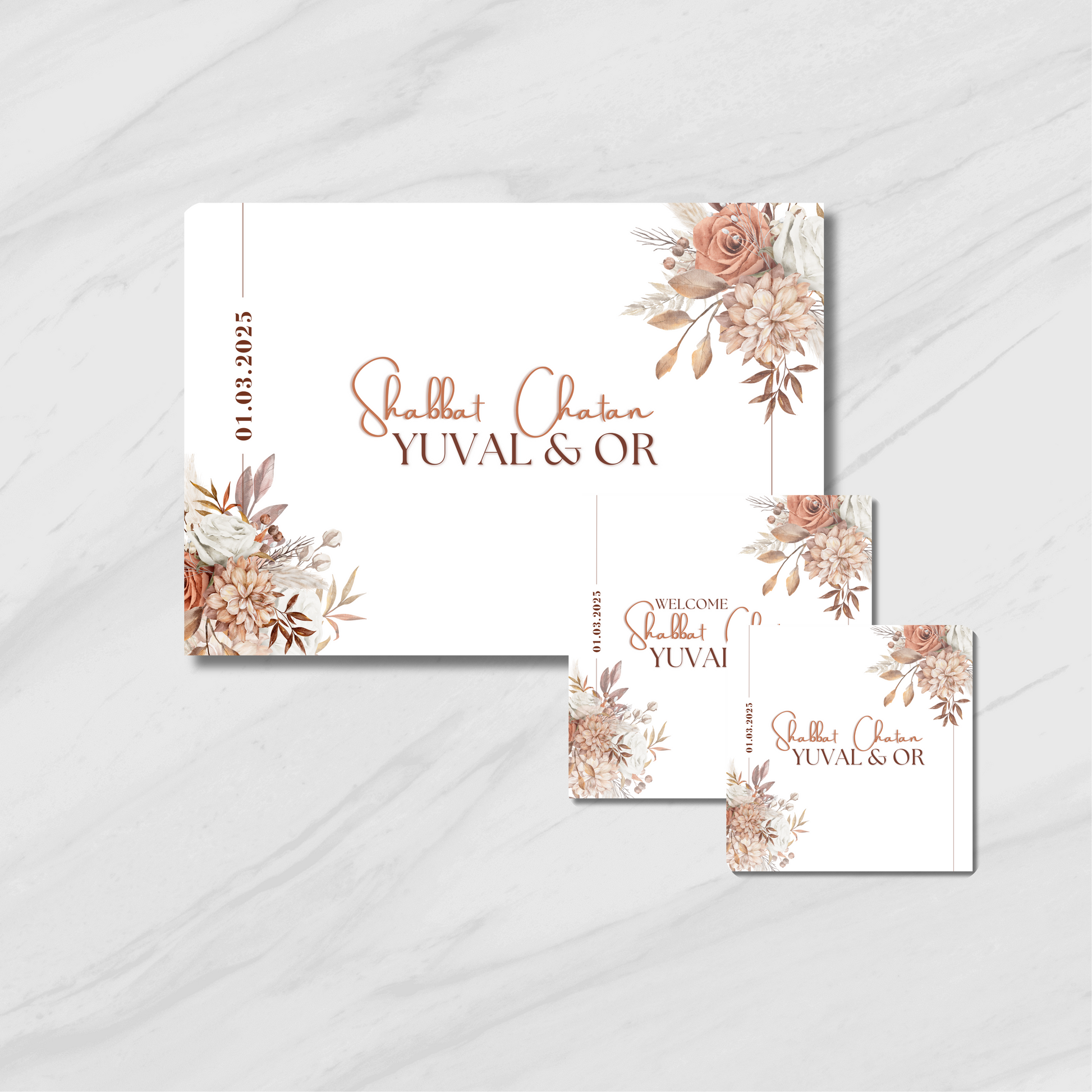 החבילה בעיצוב אלגנטי לשבת חתן נועדה להפוך את שולחן השבת לרגע מעוצב, אישי ומלא חמימות – עם שילוב הרמוני בין גווני טרקוטה, שמנת ונגיעות של זהב רך, ועיצוב פרחוני חגיגי ומכובד.