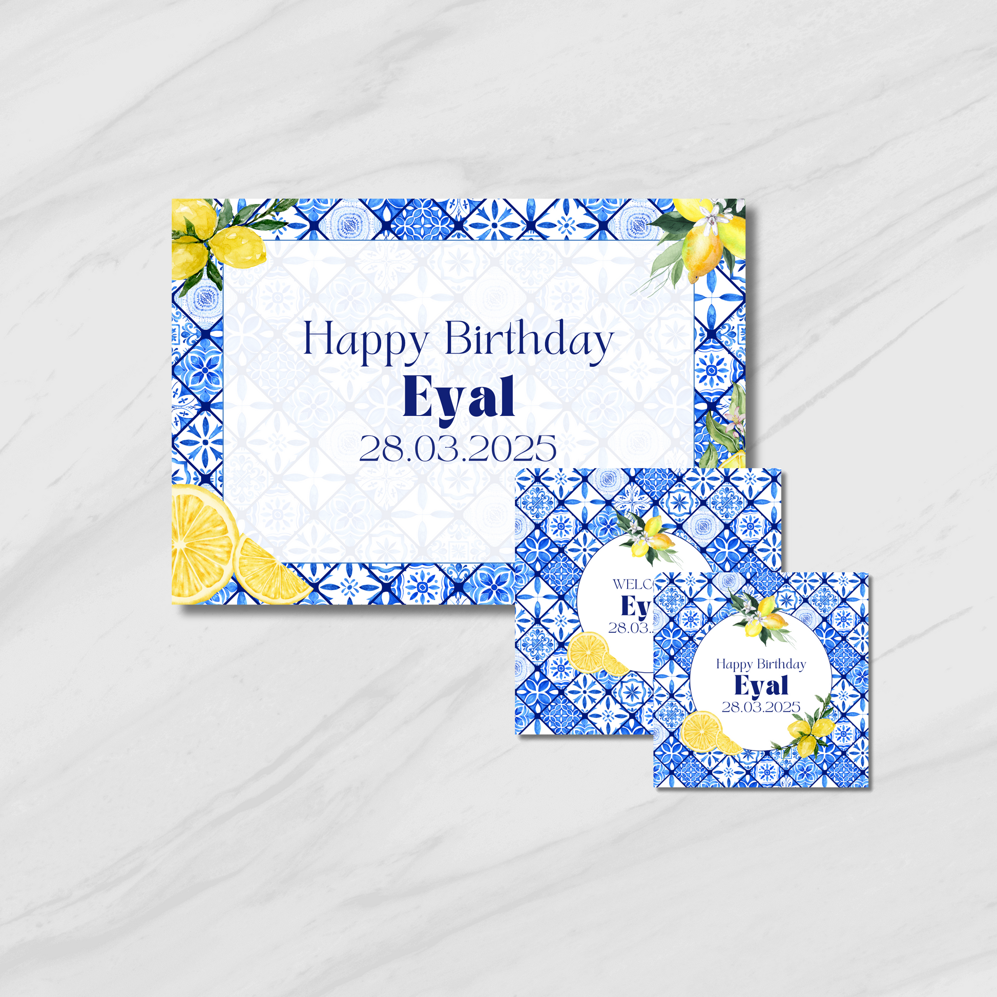 פלייסמנטים מעוצבים בגודל A3 – נקיים, מרעננים ואלגנטיים, עם צבעוניות קלאסית של כחול ולבן ודוגמאות גיאומטריות בהשראת יוון.