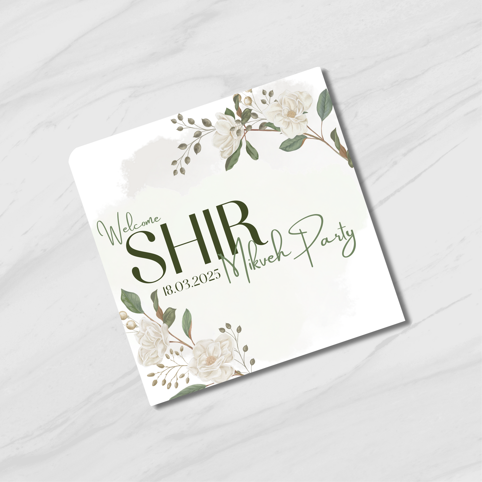 העיצוב כולל פרחים לבנים עדינים, עלים ירוקים וטיפוגרפיה רכה בגווני זית – שילוב שמעניק תחושת רוגע, ניקיון וטוהר. מושלם ליצירת שולחן שמקרין חמימות, סטייל ואכפתיות – מהפרטים הגדולים ועד הקטנים.