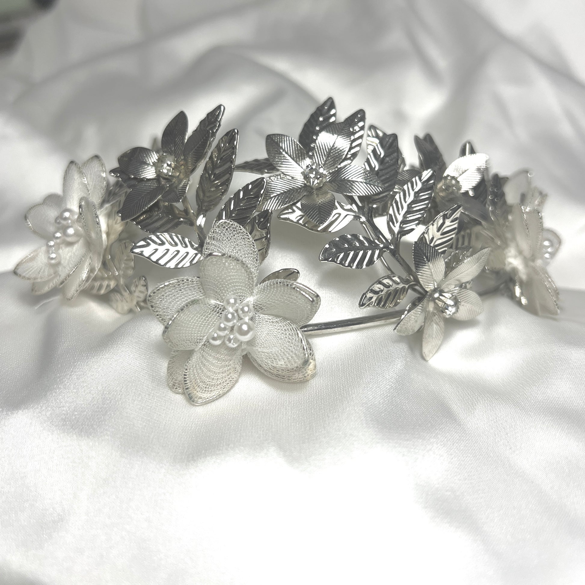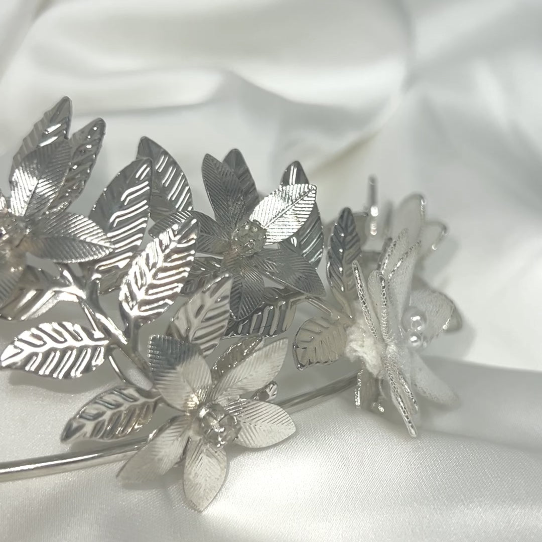 כתר שיער אלגנטי ומלא נוכחות, בעיצוב פרחוני עשיר עם עלים מפוסלים ופרחים תלת־ממדיים משולבי פנינים קטנות ועדינות. הכתר עשוי מתכת איכותית בציפוי כסף 925, עם שילוב של מרקמים חלקים וטקסטורות רשת קלילה שמוסיפים עומק ותחכום.