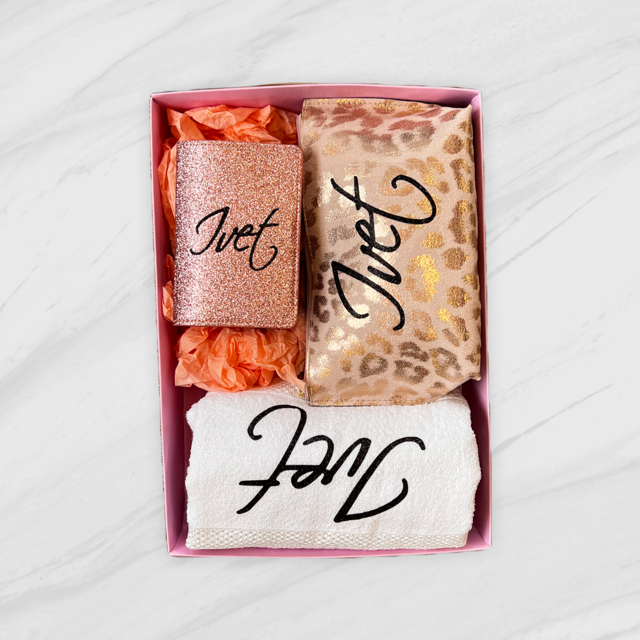 מארז חופשה המכיל תיק איפור מנומר, מגבת, כיסוי לדרכון ותיק קש.