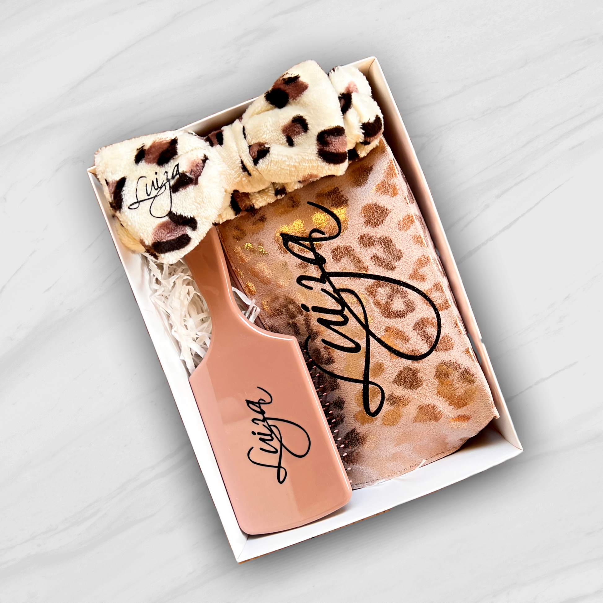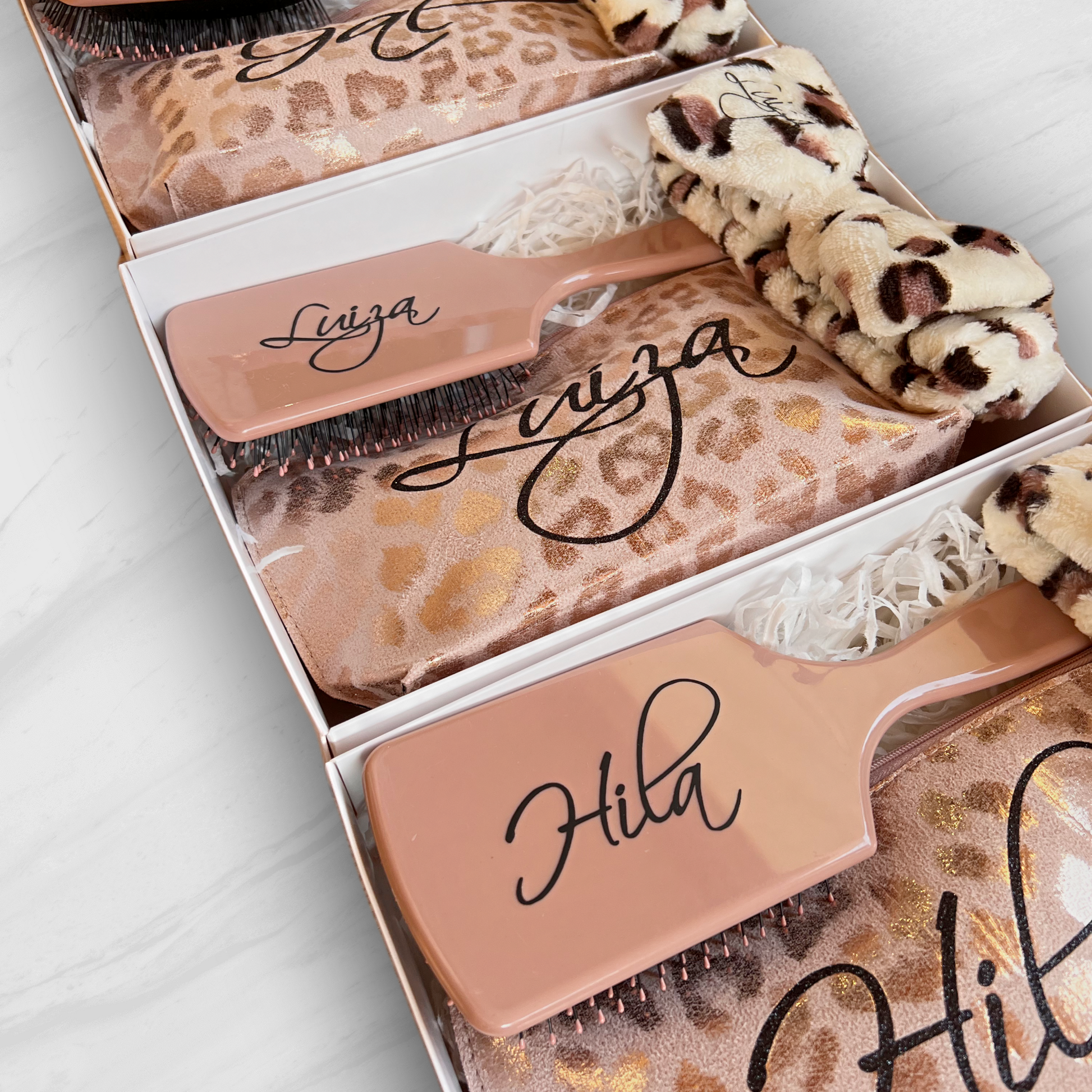 מארז מושלם מתנה למסיבת רווקות מכיל בתוכו: מברשת, תיק איפור וקשת לשיער. המארז מגיע ארוז בקופסה עם שם לבחירתך.
