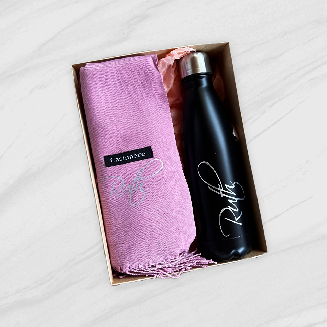 מארז תודה ממותג, מארז בקבוק תרמי וצעיף. מתנה מושלמת ליום הולדת וכדומה.
