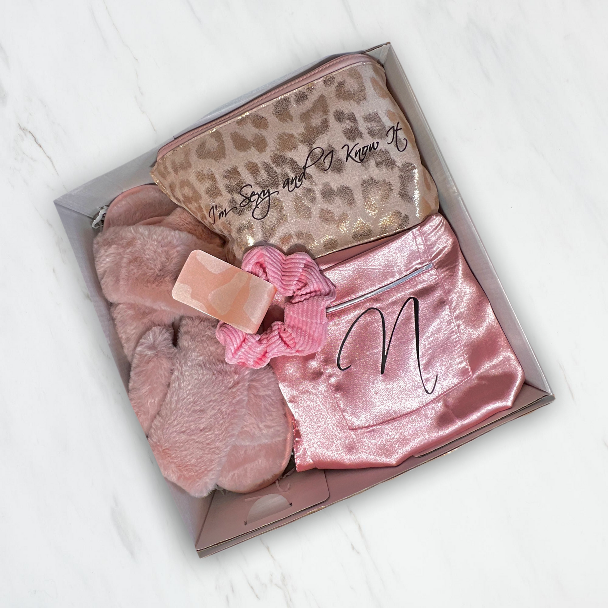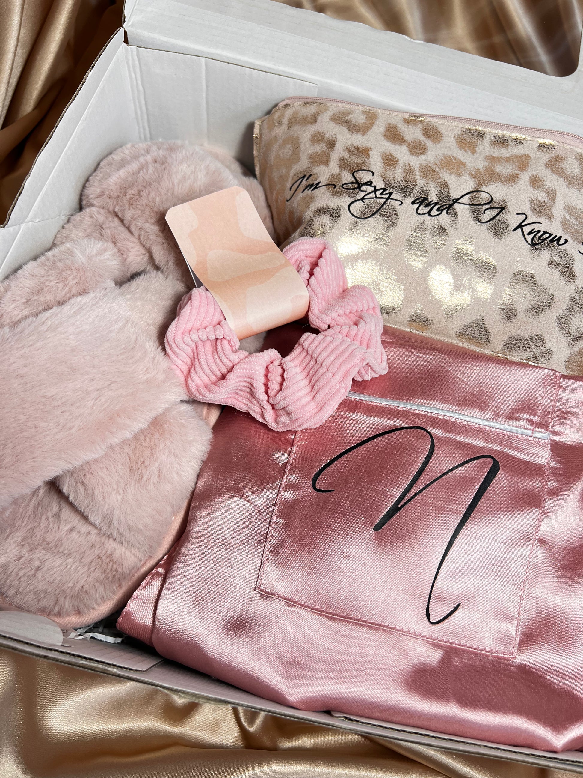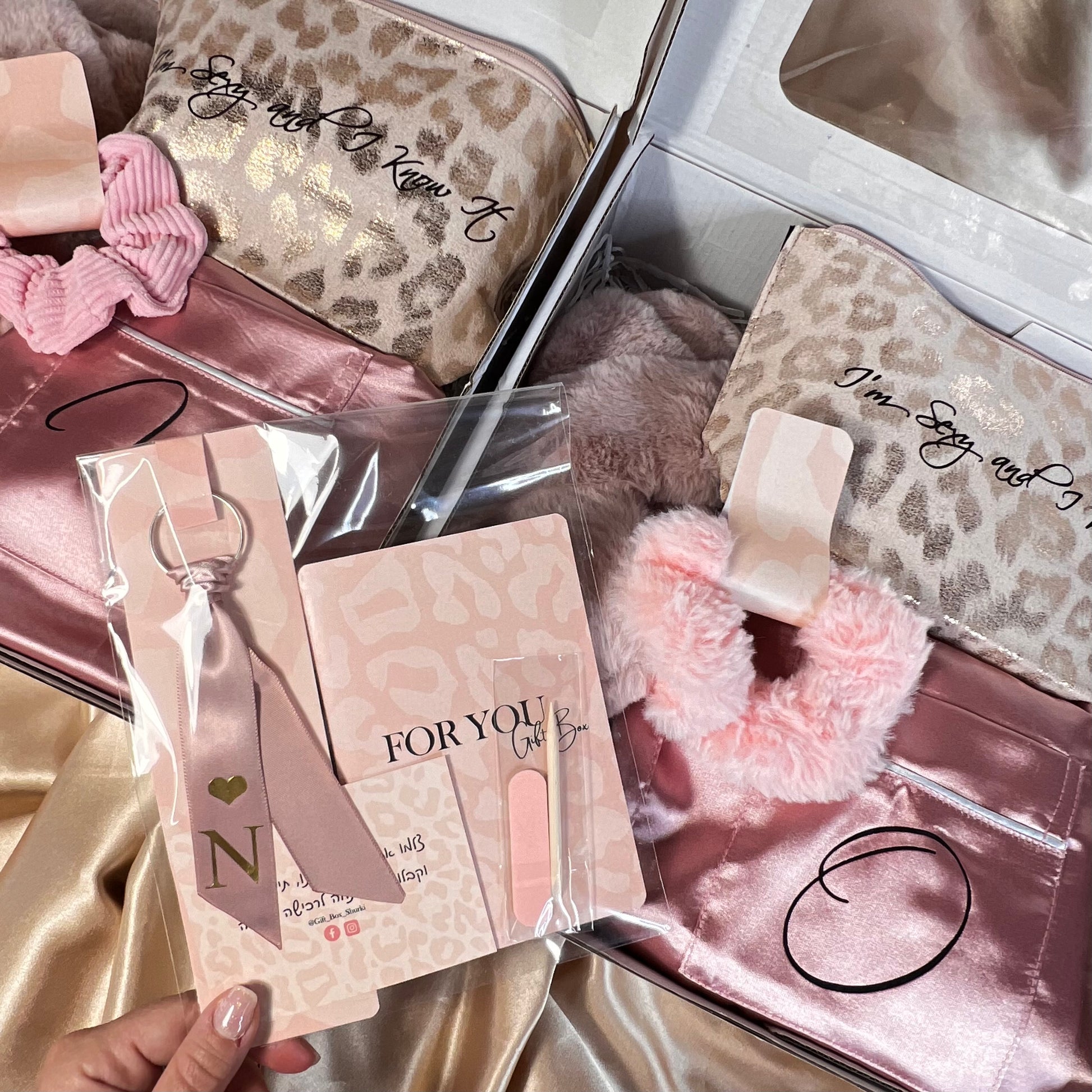 מארז מתנה ורוד ומושלם מתאים למתנת יום הולדת לבסטית שלך. מכיל בתוכו נעלי בית פרוותיות | תיק איפור | פיג'מת סאטן ארוכה וגומייה כל המוצרים ממותגים ומגיעים במארז סגור ומיוחד. ניתן להזמין בשילוב עם פיג'מה שחורה | לבנה.