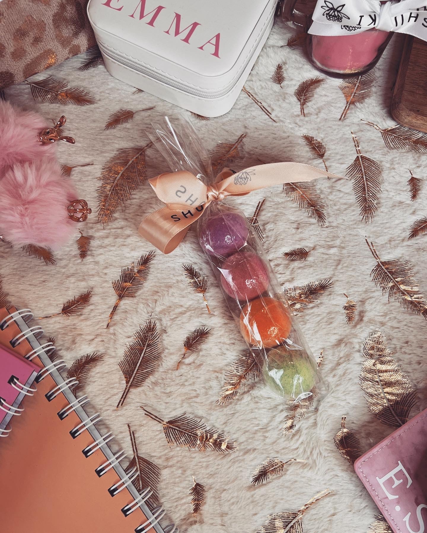 ארבע פצצות אמבטייה קטנות לשילוב במארזים.