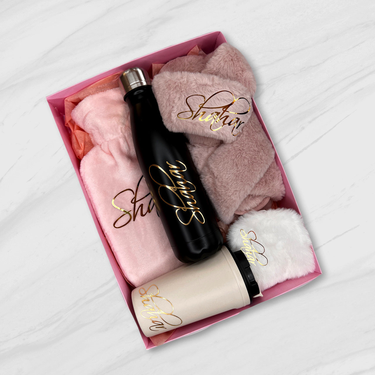 מארז מחמם, מכיל בתוכו בקבוק מים חמים |  נעלי בית פרוותיות | בקבוק שתיה תרמי, כוס רב פעמית לשתייה חמה וכיסוי עניים. כל המוצרים ממותגים ומגיעים במארז סגור ומיוחד, מגיע בצבע לבן/שמנת וורוד.