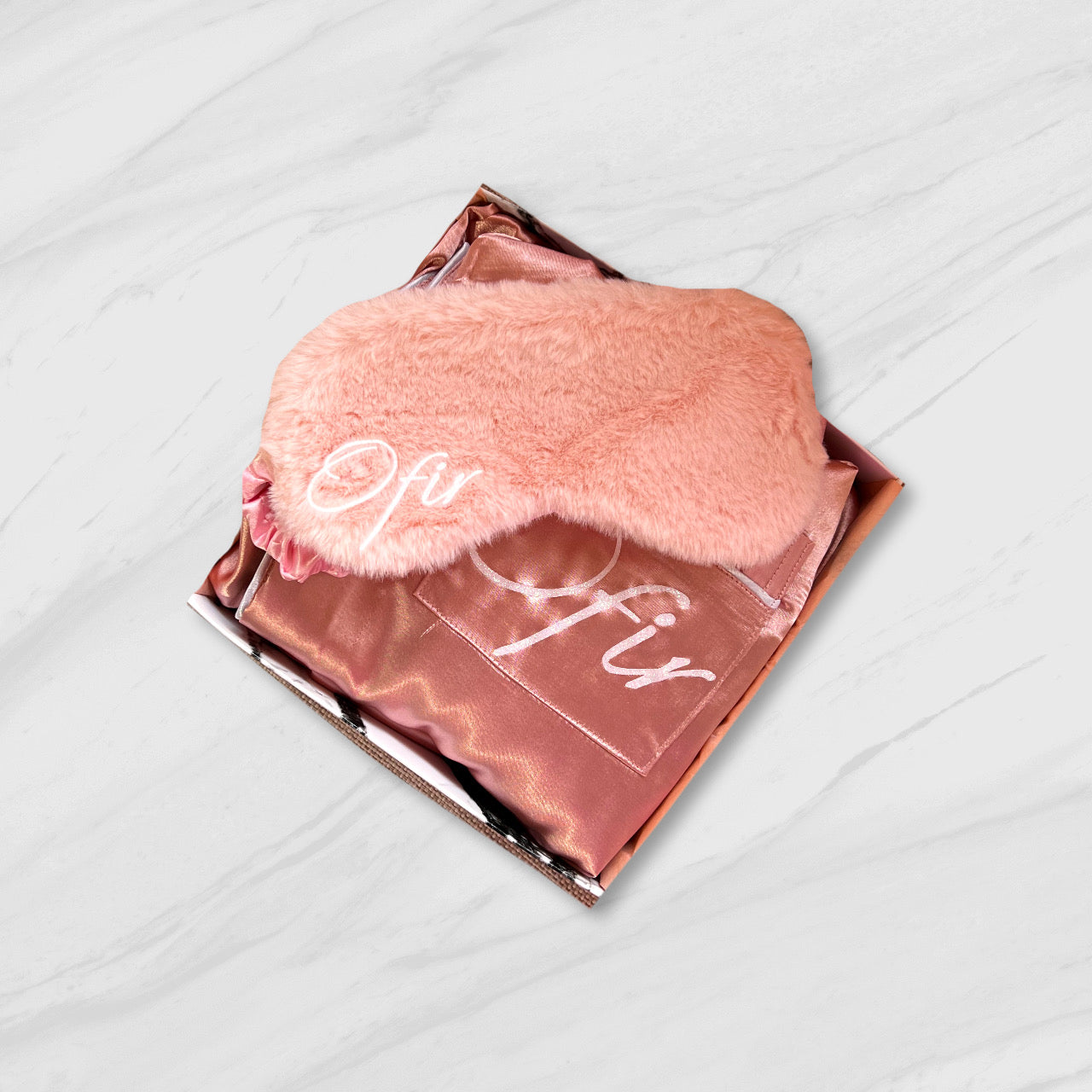 מארז מתנה, מכיל בתוכו פיג'מת סאטן ארוכה וכיסוי עניים, כל המוצרים ממותגים ומגיעים במארז סגור ומיוחד.